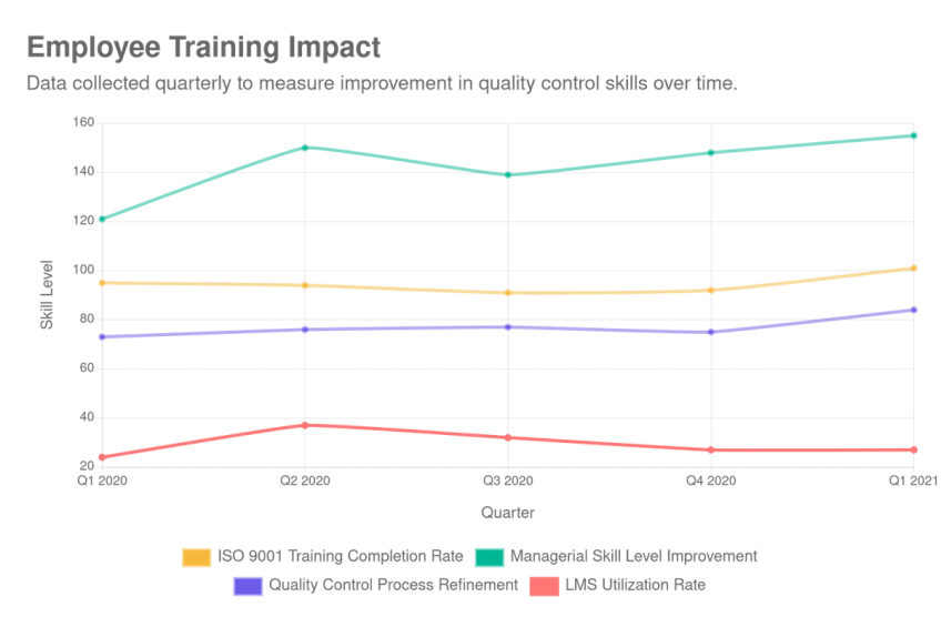 Chart: Employee Training Impact, Data collected quarterly to measure improvement in quality control skills over time.